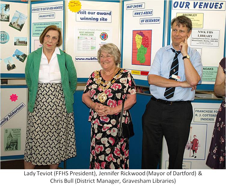The official opening of the Society's new library was held jointly by Kent County Council and our Society on Wednesday 24th June 2009. Besides representatives from KCC, Lady Mary Teviot (FFHS President) and Jean Stirk (NWK President) were also present, as well as Vice-Presidents, members of the Society committee and representatives from the Branches. This hopefully marks the beginning of a successful joint venture with KCC. Here are some photos taken by Ron Anthony on the day: